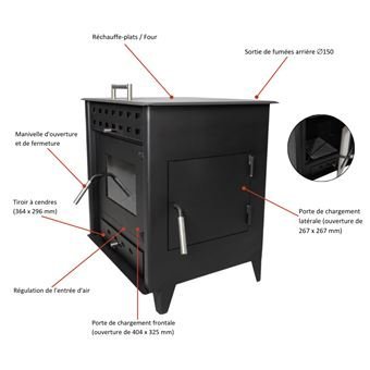 Er verfügt über einen Gusseisenboden, eine Aschenlade für einfache Reinigung und einen im oberen Bereich integrierten Backofen. Die seitliche Beschickungstür ergänzt die Fronttür für bequemen Zugang. Die Griffe und Knöpfe aus Edelstahl sorgen für Sicherheit und Langlebigkeit.