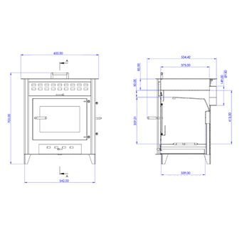 Er verfügt über eine Feuerstelle aus Gusseisen, eine Aschenlade für einfache Reinigung und einen integrierten Backofen im oberen Bereich. Die seitliche Beschickungstür ergänzt die Fronttür für bequemen Zugang. Die Griffe und Knöpfe aus Edelstahl sorgen für Sicherheit und Langlebigkeit.